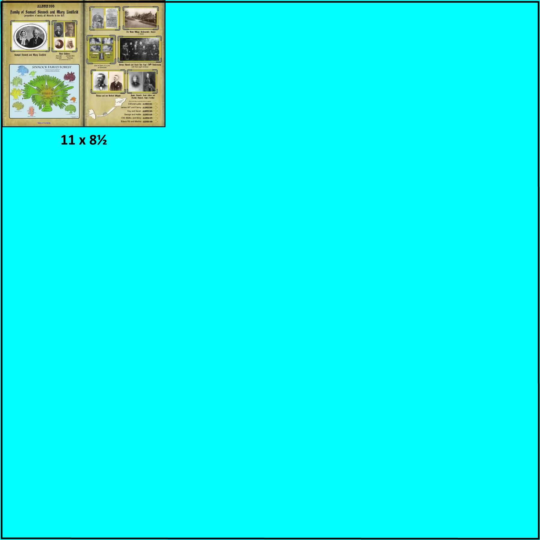 | 2012 to 2016, Illustrator layered PDF file, printed on 11x8½ inch paper 14 similar albums were drawn in Adobe Illustrator, loading JPG file for the pictures from the Sinnock genealogy website | |