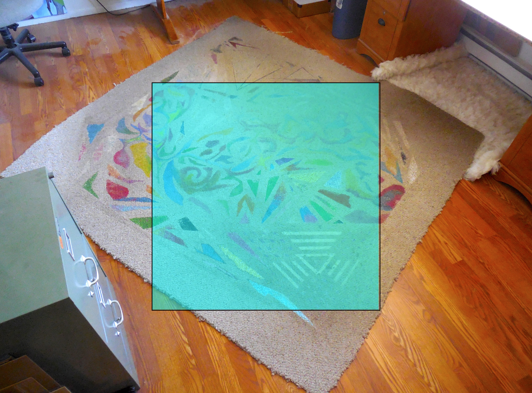 | April 2014, 84x80, thinned acrylic and glued glitter on carpet made with masks after I leaked epoxy on my carpet in Woodstock while making 101 Things from my Apartment, photo taken after 5 years of wear in my office in Palisade separator between male and female is S-shape in the middle composed of flowing curves, male and female are both linear abstractions surrounding the curve | |